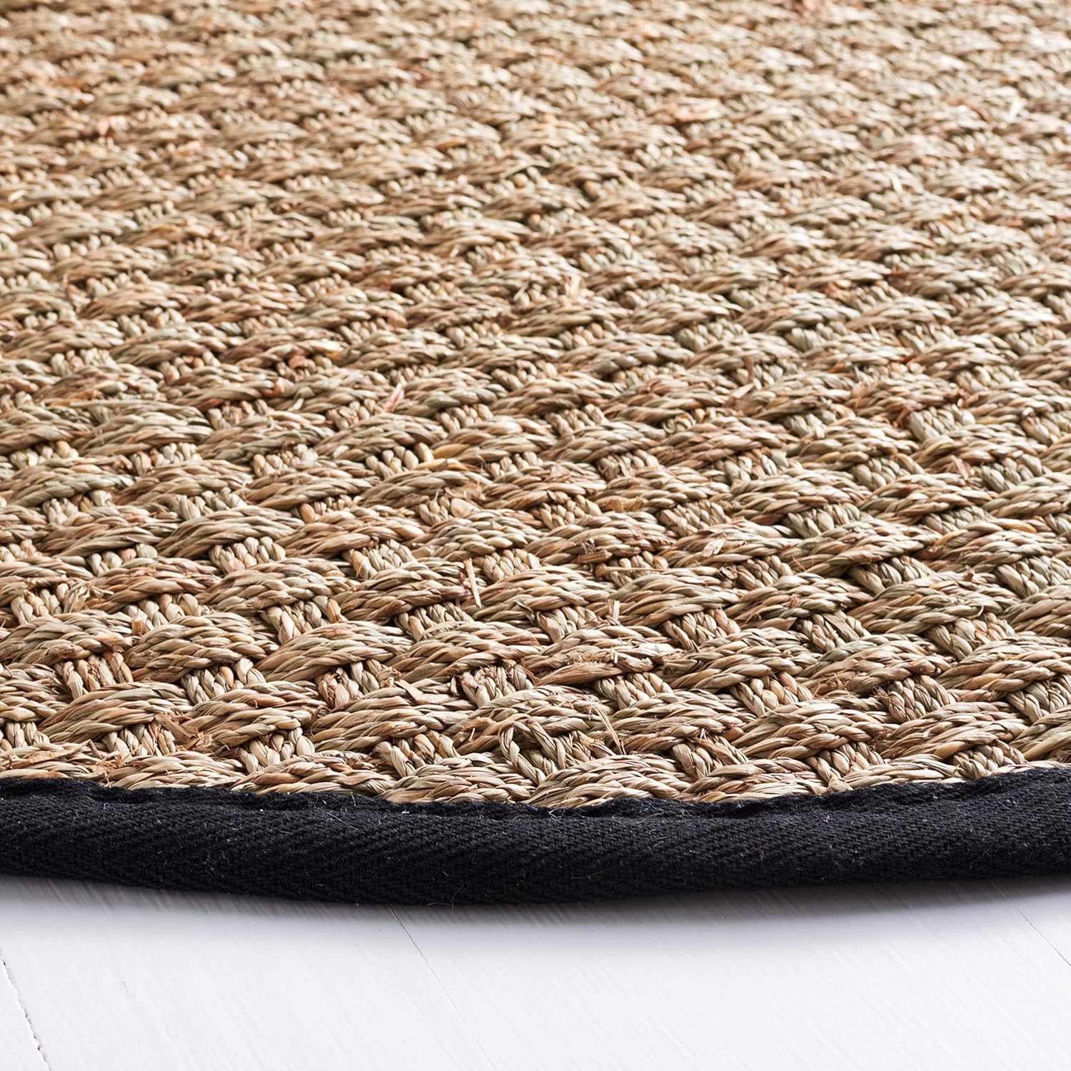 Durable and eco-conscious 3‑ft round rug made of sustainably sourced seagrass, bordered in black cotton—perfect for high-traffic spaces and adding natural texture.
